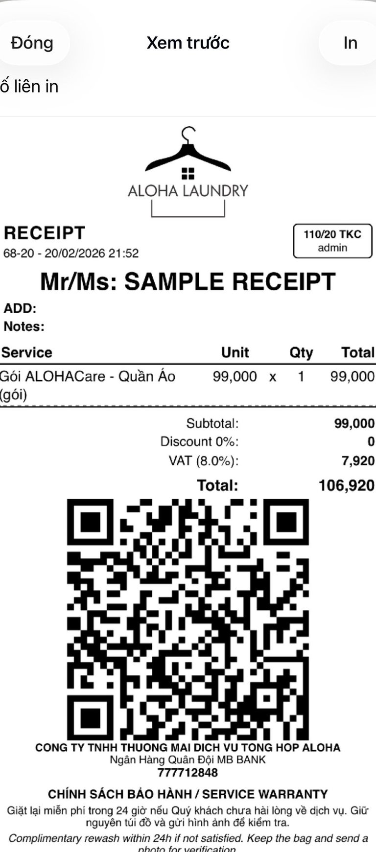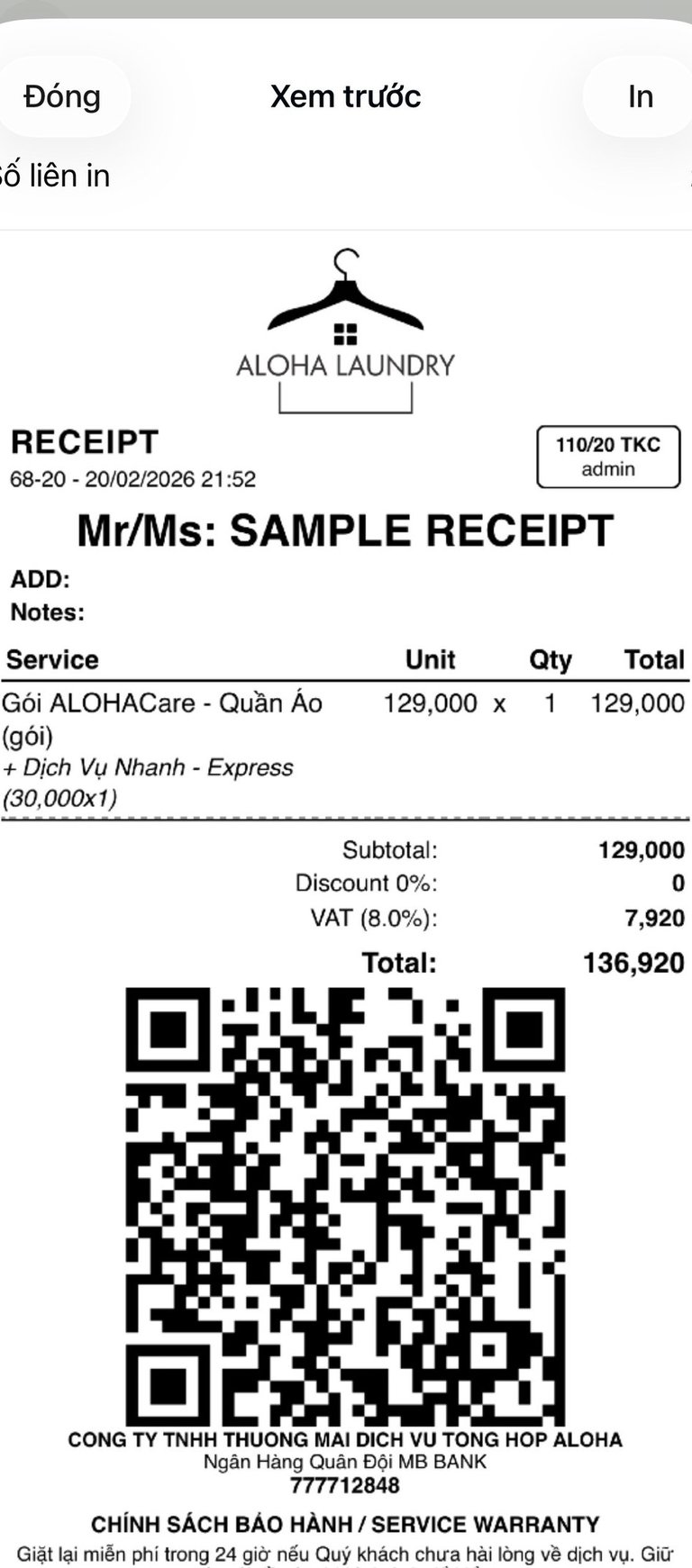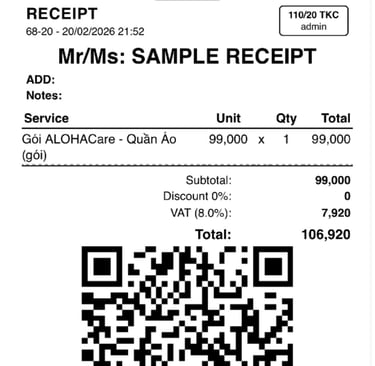 One of the most common fears among international travelers is hidden fees. At Aloha, the full price is calculated and clearly presented before we begin washing. You review the amount first, and we only proceed once you agree. After completion, you receive a proper bill with detailed pricing. Payment is made to Aloha’s official company account, and VAT invoices can be issued in accordance with Vietnamese regulations. For business travelers, this makes reimbursement simple. For tourists, it provides reassurance that everything is documented and legitimate.